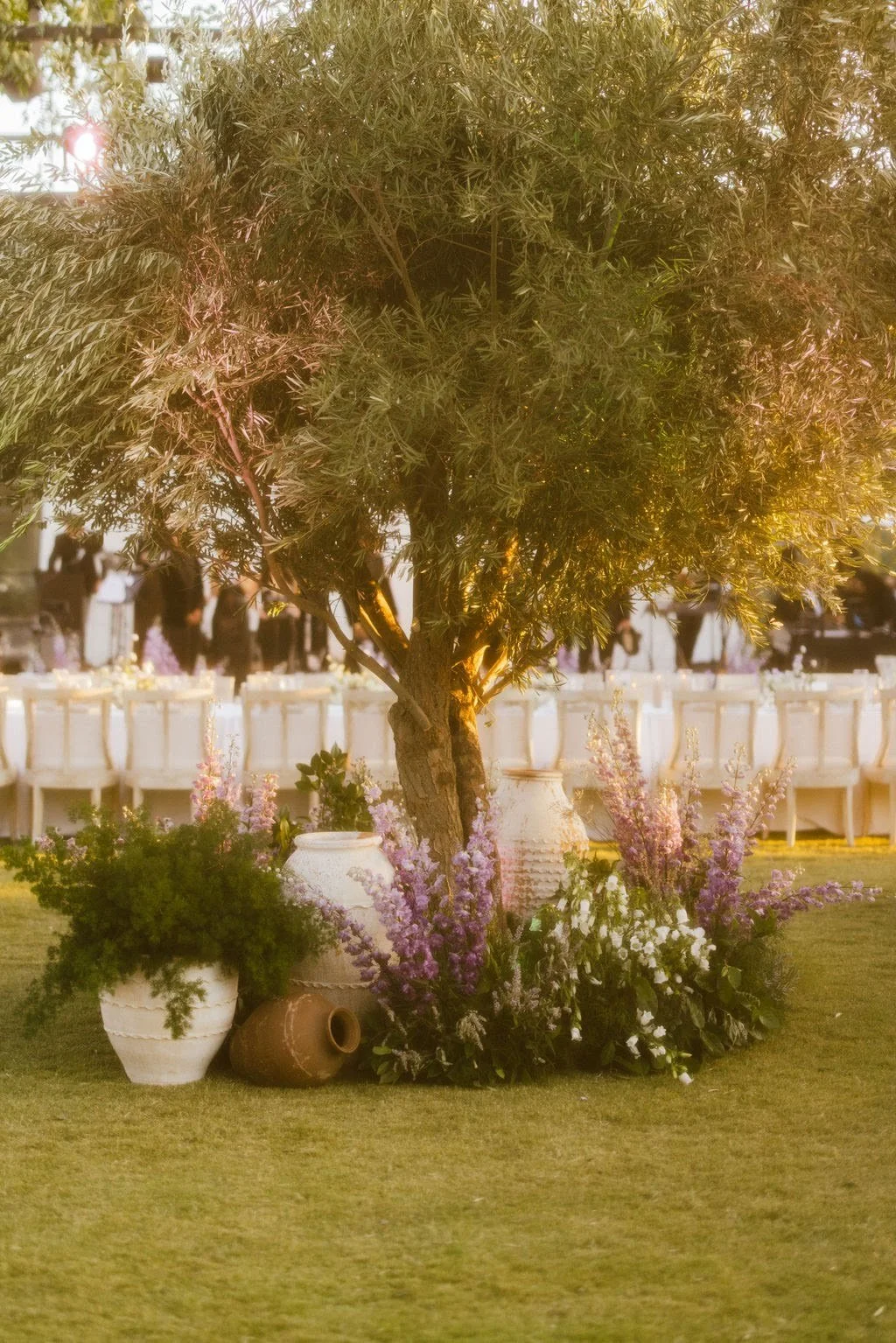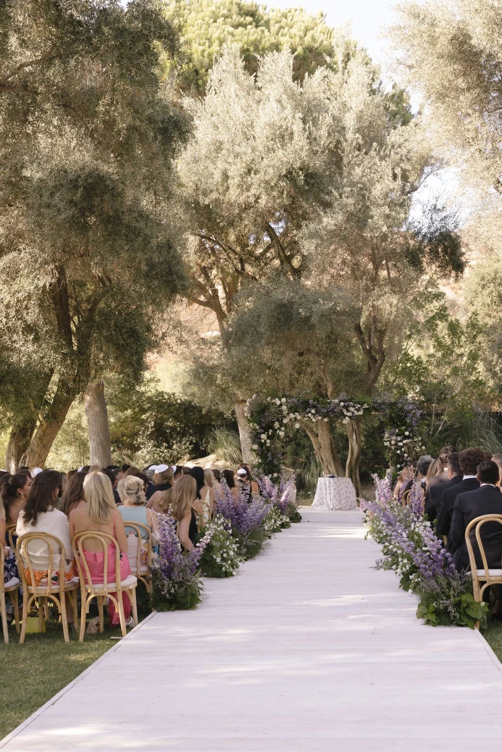 Emily and Jason flew in from New York to celebrate their wedding at the iconic Hummingbird Nest Ranch venue. The wedding was envisioned to be a bespoke design of a lavender and aubergine palette inspired by the lavender fields in the French countryside, Provence. To set the tone for the wedding decor, we incorporated antique and earthen ceramics balanced with contemporary fluted glass. Highlights include an expansive and abundant chuppah accented with imported, antique pots. Guests continued their way into cocktail hour to find a more intimate, backyard-garden feel. Stone troughs and weathered pots were filled with rambling, potted plants and artistic bar arrangements. Reception space was marked with an impressive orangerie structure, layered with vining greenery at towering heights.